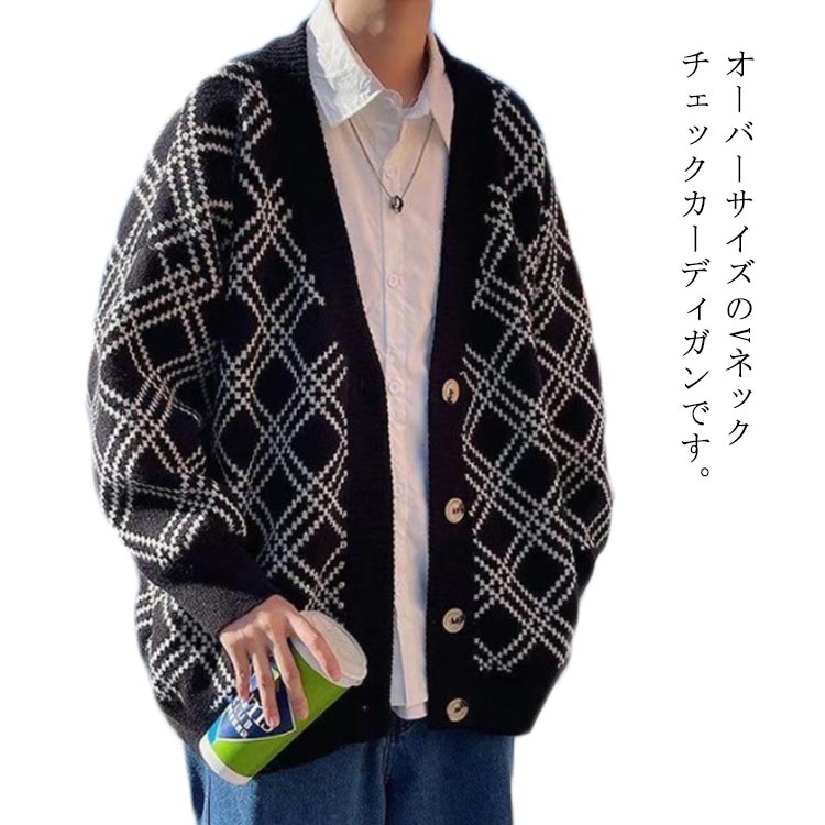 チェック柄 ニット カーディガン ソフトタッチ ゆったり Vネック 長袖 秋 冬 メンズ カーキ色 ブラック イエロー M-3XL