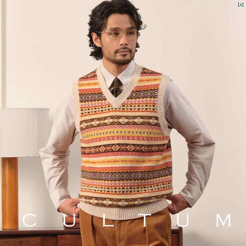 メンズメンズファッション英国ファッションオシャレ大人男性 100 メリノウール ニット フェアアイル ベスト レトロ カレッジ セーター