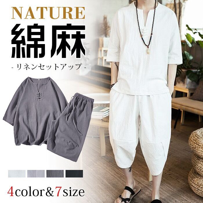 綿麻上下セット セットアップ リネン メンズ ワイドパンツ サルエルパンツ 上下 ルームウェア 半袖 薄手 シャツ パンツ 部屋着
