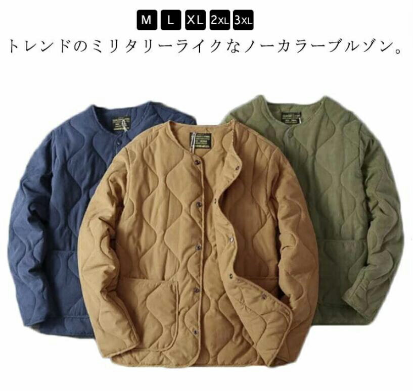 長袖 ステッチワーク ノーカラー ミリタリー キルティング ブルー グリーン 体型カバー ジャケット