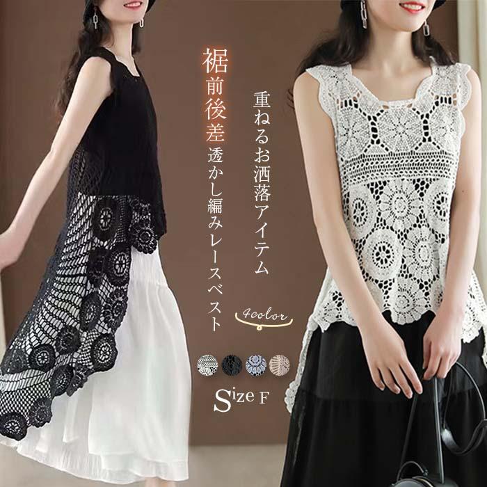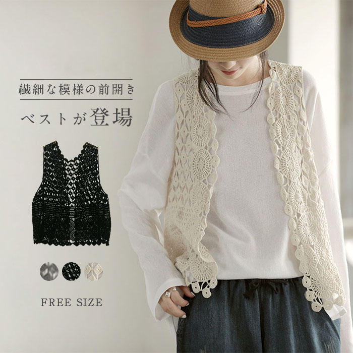 トレンドの透かし編みでインナーとのレイヤードスタイルを楽しめるレースベスト 前後差のある裾デザインにも雰囲気アップ