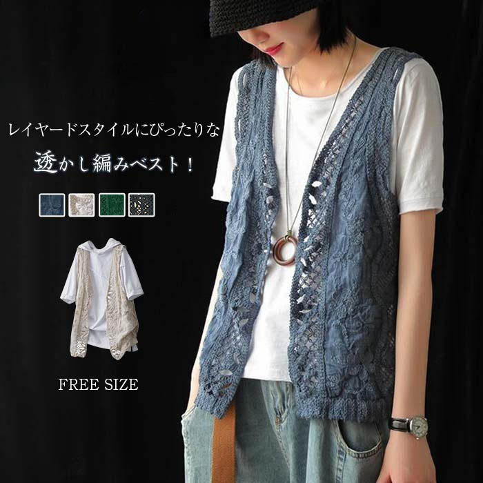 透かし編み ニット ベスト ショート ベスト レディース 春夏 春 おしゃれ レイヤード風 森ガール 透け感 シンプル コットン 綿