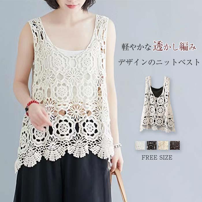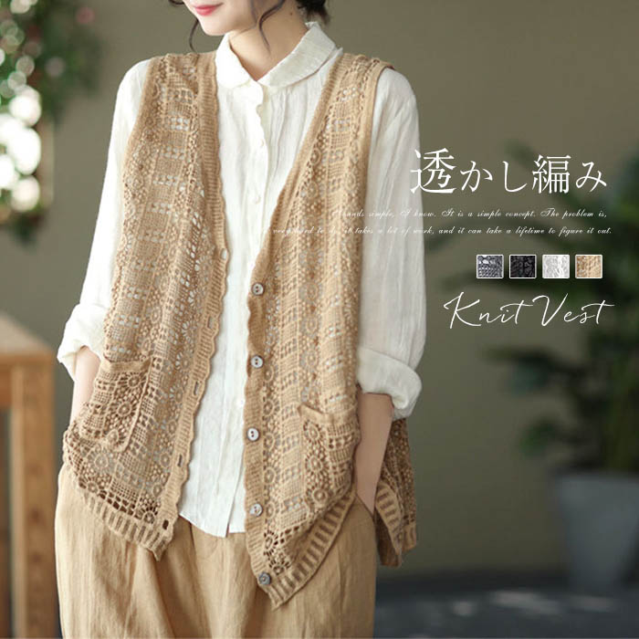 ベスト レディース 春夏 ニット ベスト おしゃれ ベスト 春 夏 ベスト レディース トップス ベスト ネック ゆったり 体型カバー オーバーサイズ プルオーバー 透かし編み