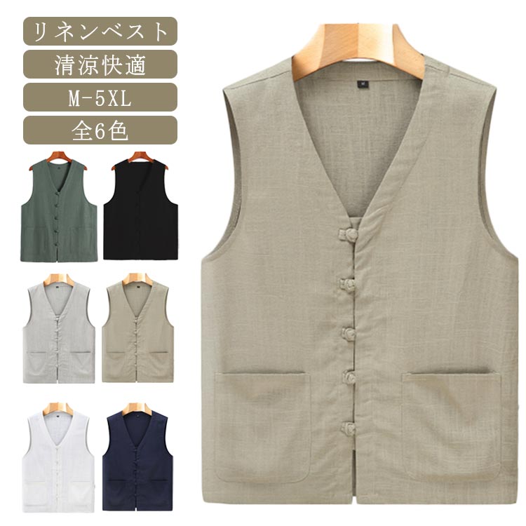 30代 麻 チョッキ ベスト 春夏 綿麻 ギフト ジレ 綿 20代 薄い コットン リネン 中華風 清涼 コットンリネン ネック 40代 50代 60代 高齢者 父の日 敬老の日 プレゼント メンズ