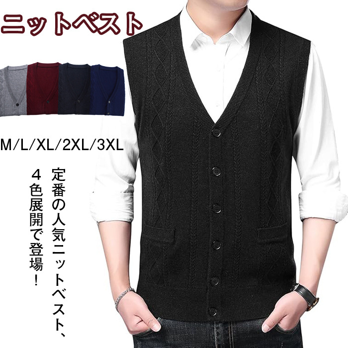 ニットベスト メンズ 前開き ベスト Vネック カーディガンベスト ビジネスベスト ニット トップス インナーベスト ボタン付き 無地 通勤 春 秋 冬 M-3XL