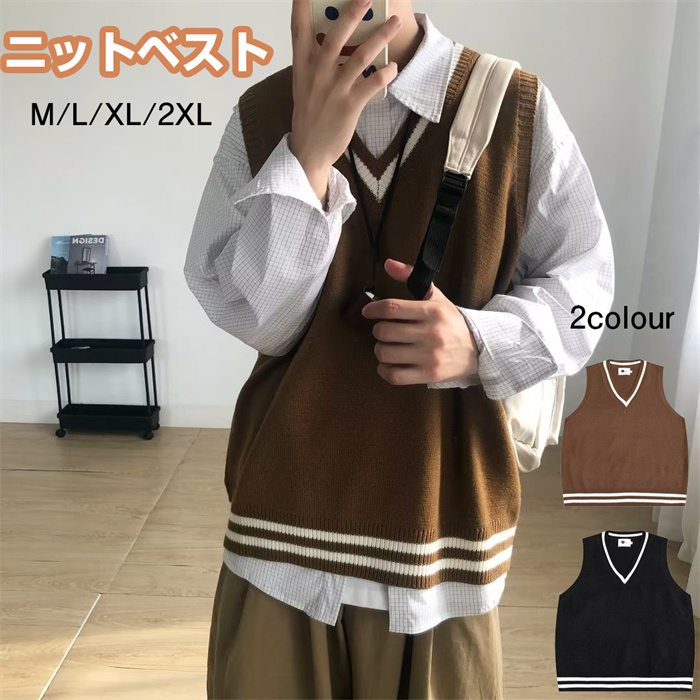 ニットベスト メンズ Vネック セーターベスト ノースリーブ セーター トップス 無地 ゆったり カジュアル おしゃれ 春 秋 冬 ブラック ブラウン M-2XL
