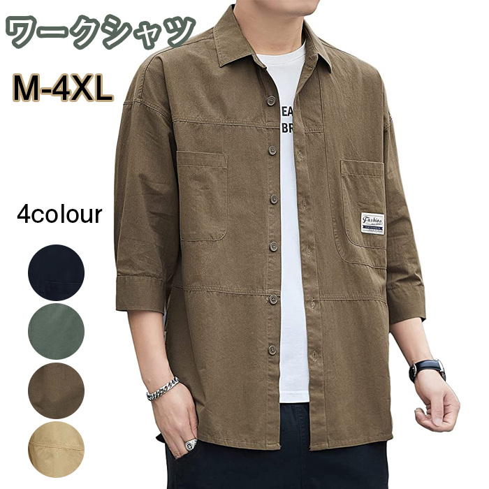 ワークシャツ メンズ 7分袖 シャツ かっこいい ミリタリーしゃつ 無地 夏服 しちぶそで 上着 ワーク系 襟付き トップス スリムフィット 大人 アメカジ 服 綿100% おしゃれ