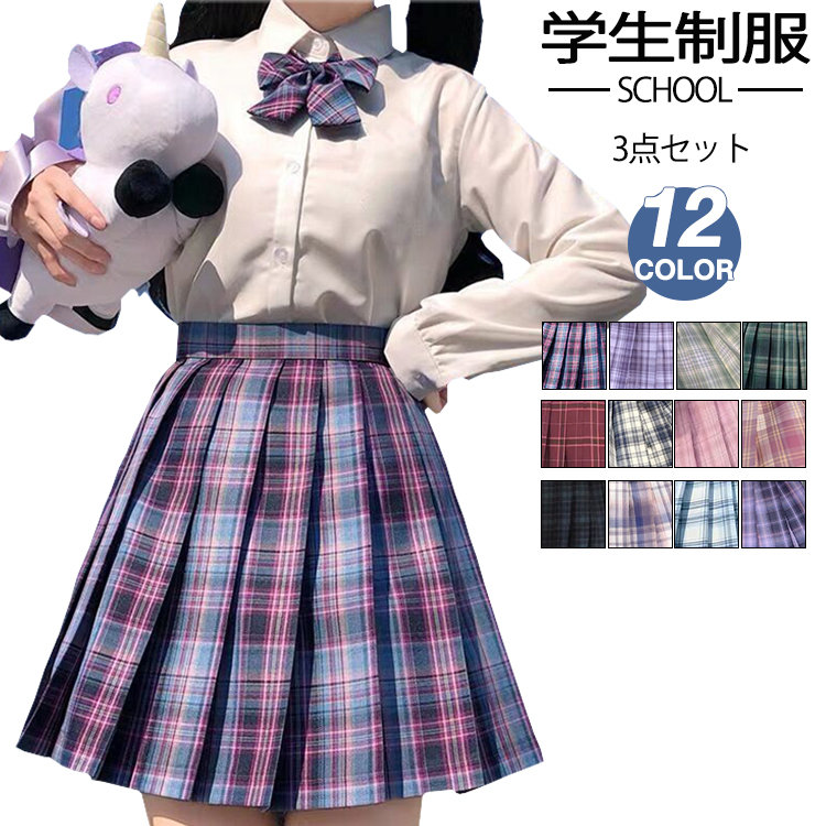 制服 学生制服 3点セット スカート チェック柄 上下セット 蝶ネクタイ付き プリーツスカートレディースファッション 学生服 その他