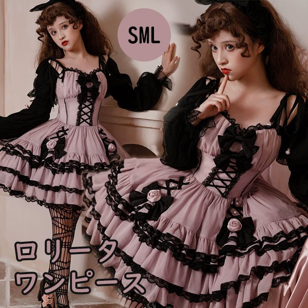 ワンピース ロリータ ハロウィン シスター風 膝丈 レディース ゴスロリ ハイウエスト ライン 暗黒風 ロリィタファッション 長袖 リボン フリル