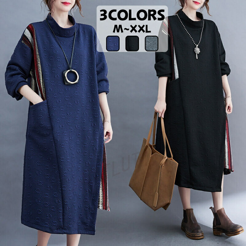 ロングワンピース ロング 膝丈 きれいめ Aライン ハイネック 大人 上品 カジュアル シンプル 切り替え リゾート ミモレ丈 長袖 大きいサイズ