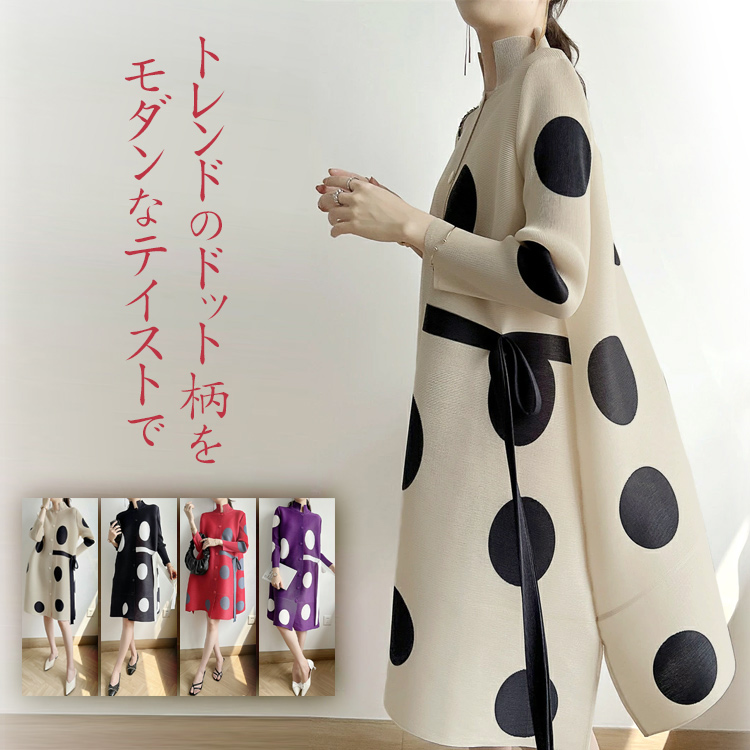 大きなドット柄が目を惹く、華やかで上品なワンピース ゆったりとしたスタイリッシュなデザインが体型カバーにもなる魅力的なアイテム♪