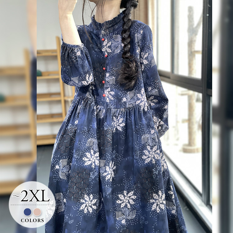ワンピース 長袖 ミモレ丈 膝下 花柄 花柄ワンピース スタンドカラー 大きいサイズ 大人かわいい 秋 冬 春 美人 レディース 30代 40代 50代 ブルー ベージュ クラシカルワンピ レトロ レ