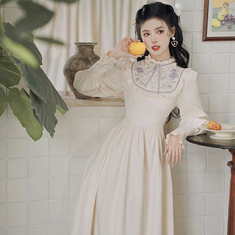秋新作 レディースワンピース レトロ調ワンピース 刺繍 フリル衿 裾フリル ロングワンピース 長袖 ミモレ丈 バックリボン きれいめ クラシック クラシカル オフホワイト -