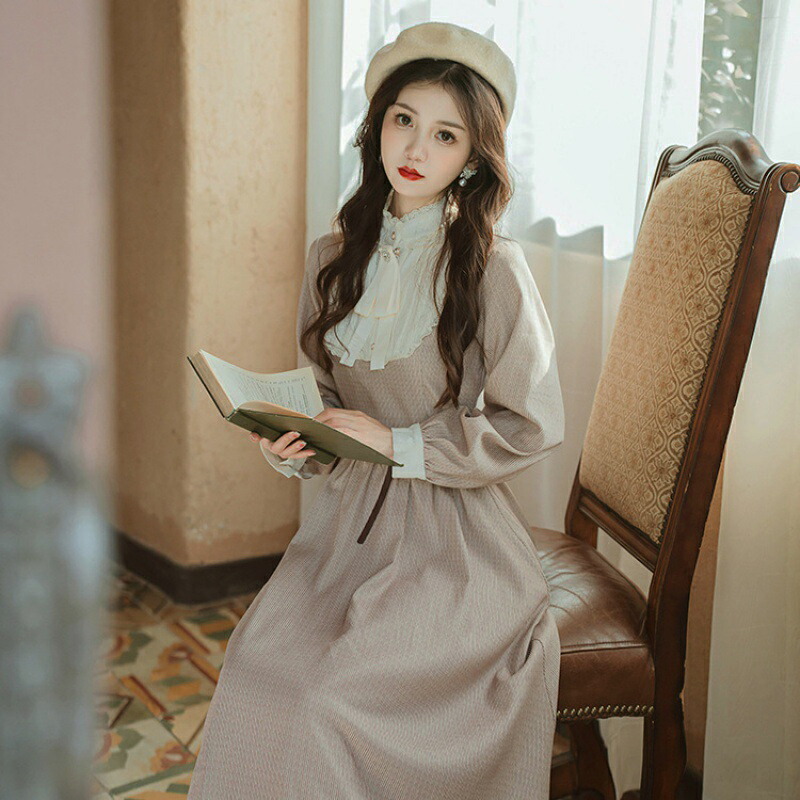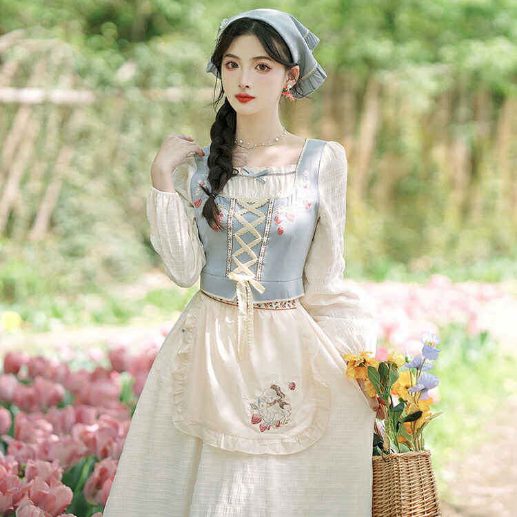 秋新作 レディースワンピース レトロワンピース ロングワンピース カントリー クラシック クラシカル きれいめ 刺繍 エプロン付きワンピース 長袖 ロング丈 -