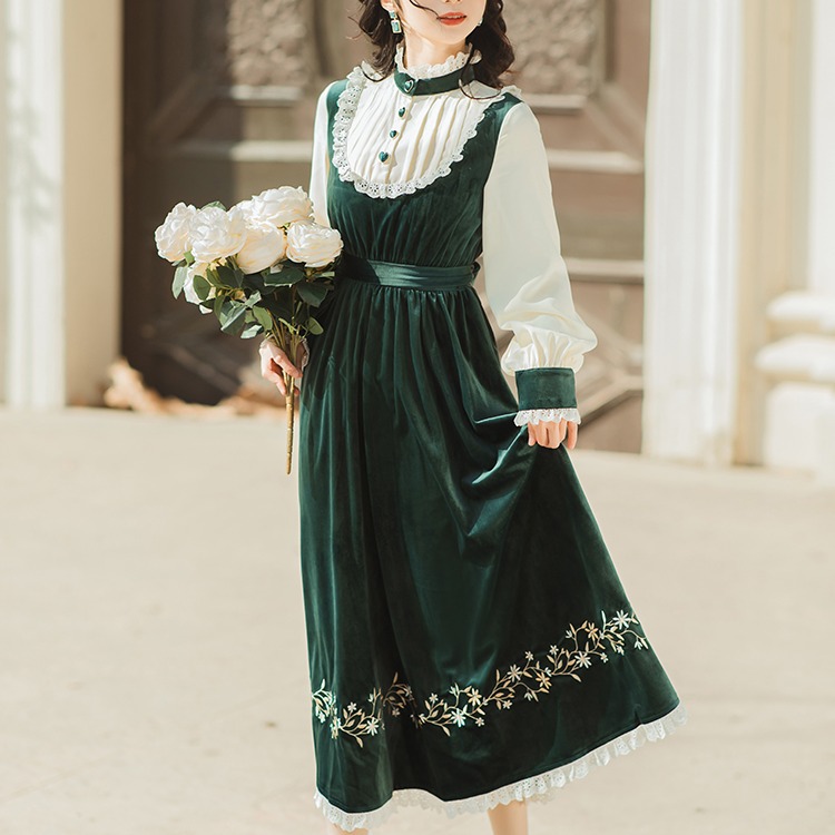 秋 冬 大きいサイズ レトロワンピース 冬 レディース ワンピース 刺繍 長袖 ロング レトロ クラシカル クラシック 姫系 ワンピースセットアップ グリーン お淑やか系ワンピース 淑女 お人形 お姫