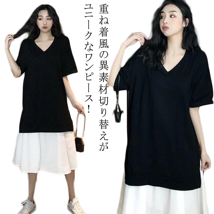 ロングワンピース 切り替えワンピース 春 秋 夏 半袖ワンピース きれいめ 重ね着風 膝丈 ロング丈