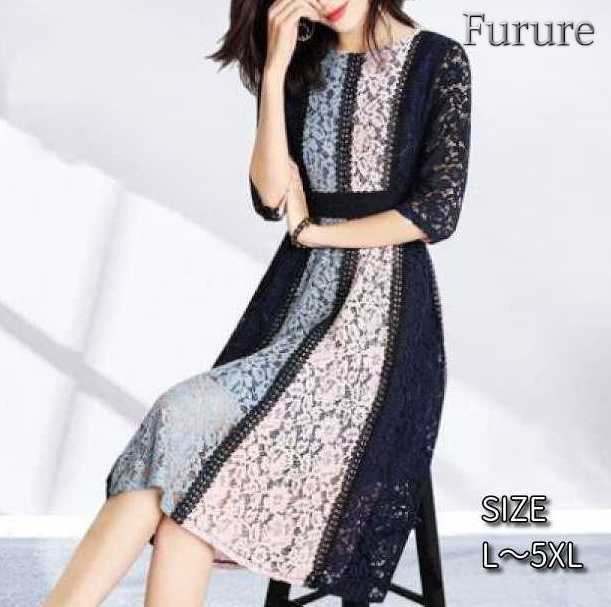 きれいめワンピース 30代 韓国ファッション レディース 大きいサイズ L XL 2XL 3XL 4XL 5XL 個性的 目立つドレス ワンピース 虹色 マルチカラー 総レース ウエストマーク ラウン