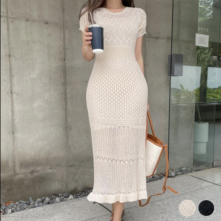 ワンピース レディース クロシェ 半袖 サマーニット メッシュ 透かし編み ミモレ丈 タイト 春 夏 セクシー エレガント シアー シースルー おしゃれ 韓国