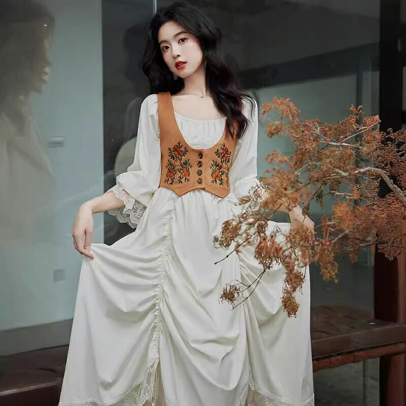 秋新作 レディースワンピース セットアップワンピース 2点セット レトロ調ワンピース 刺繍ベスト+ワンピース 裾フリル ロングワンピース クラシック クラシカル 長袖 ロング丈 花柄刺繍 ボタニカル柄