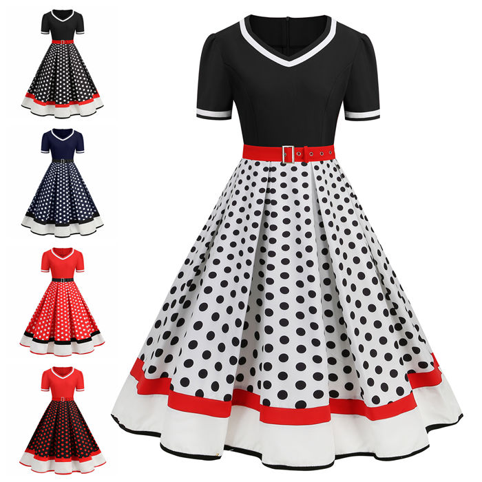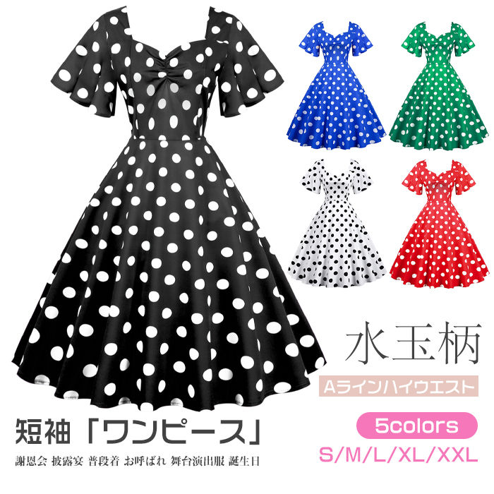 5色 S-2XL 水玉柄 レトロワンピース レディース 結婚式 短袖 ロカビリー 着痩せ ハイウエスト