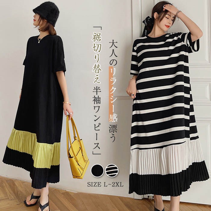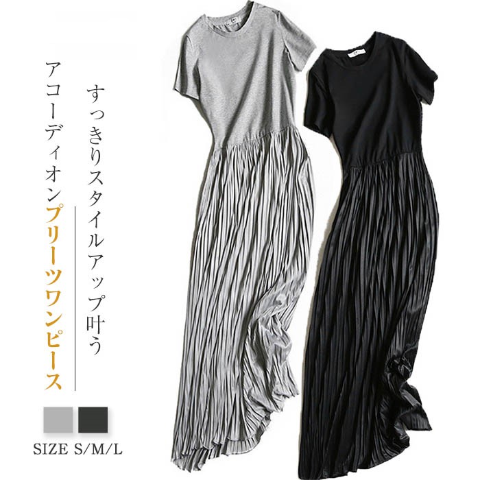 動くたびに綺麗なプリーツが大人っぽさを演出 プリーツ切替tシャツワンピース クルーネック tシャツ ワンピース インナー ワンピース コットン混 綿混 プリーツ ハイウエスト 重ね着
