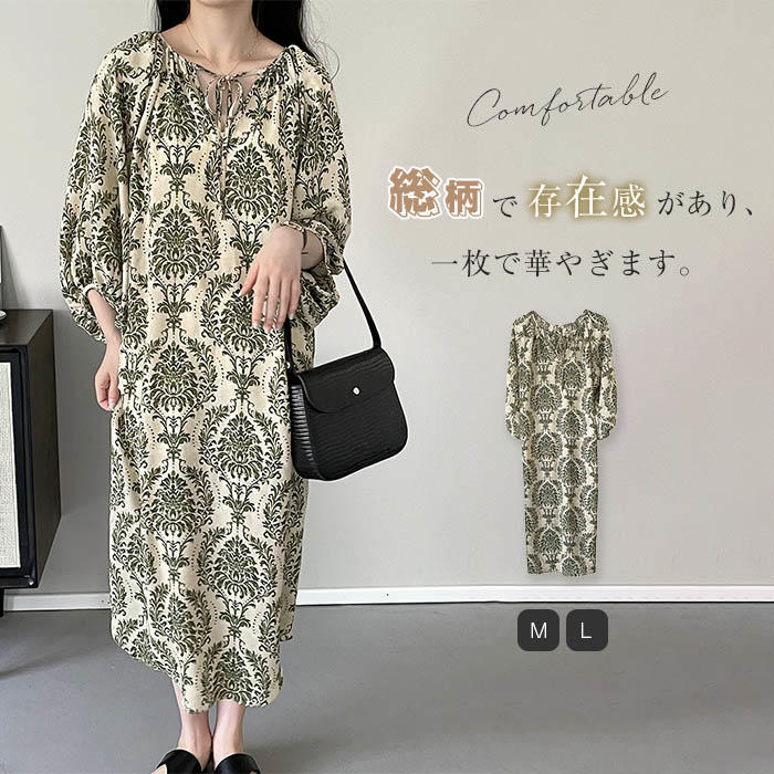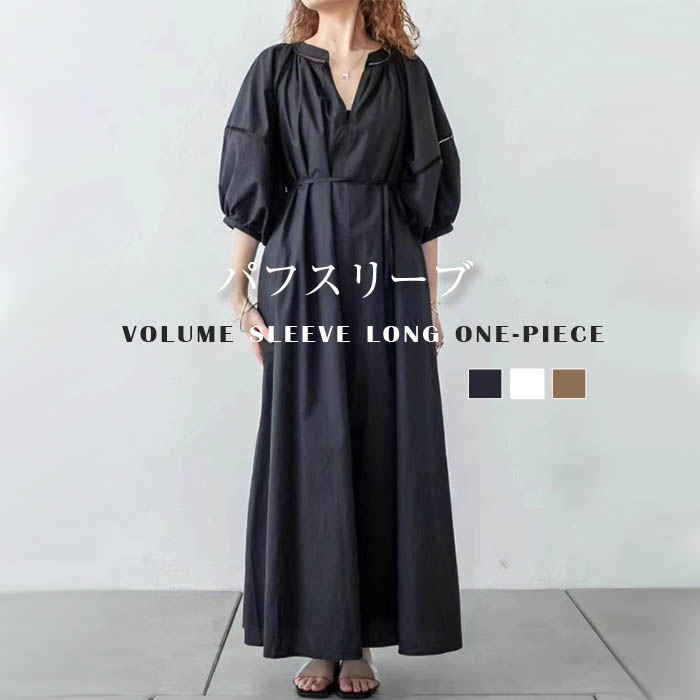 2way ワンピース レディース 七分袖 春夏 ロングワンピース マキシワンピース 無地 エレガント パフ袖 パフスリーブ Aライン フレア ギャザー ゆったり カジュアル 前後2WAY