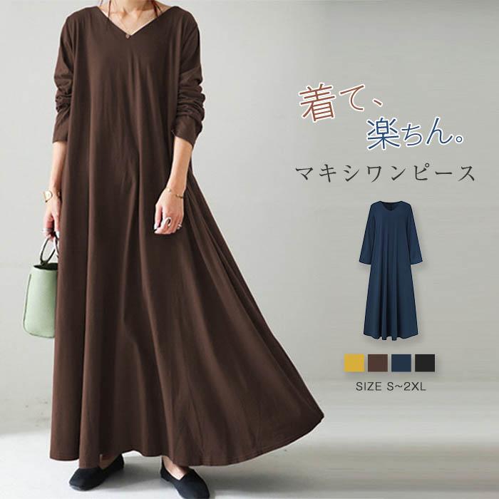 Tシャツ ワンピース 長袖 マキシワンピース aラインワンピース フレアワンピース 長袖 Vネック ロングワンピース ロング ゆったり 体型カバー マタニティ 通勤 カジュアル 大人