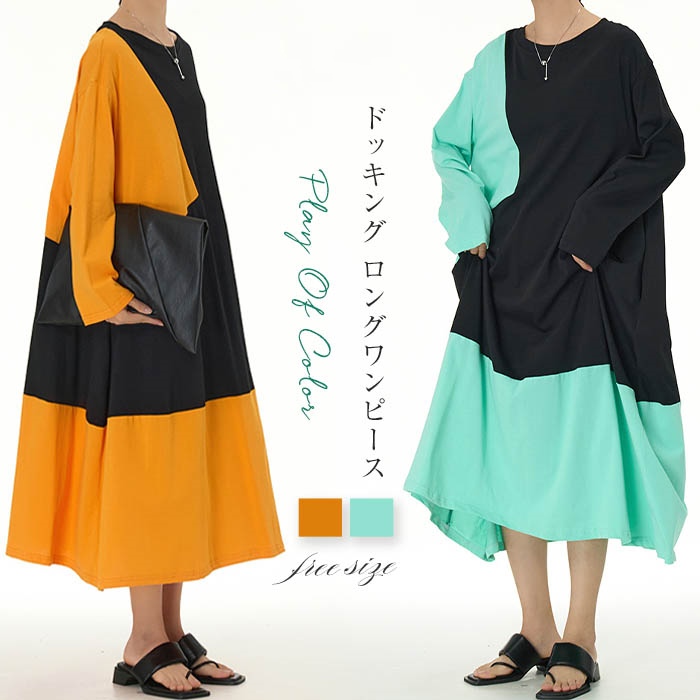 ワンピース レディース 長袖 フレアワンピース フレア aライン 長袖ワンピ クルーネック tシャツ ワンピース ロング 配色 無地 切り替え お洒落 ファッション 個性的