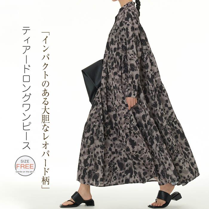 ティアード切り替え マキシ 長袖 ワンピース 春 レディース カジュアル フレアワンピース レオパード ロングワンピース マキシ丈ワンピ 夏 ロング バンドカラー ゆったり 体型カバー