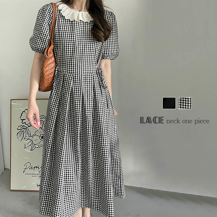 半袖 ワンピース レディース 夏 パフスリーブ ロングワンピース きれいめ エレガント パフ袖 可愛い ライン ゆったり 大人 フレアワンピース ギンガムチェック ブラック デート