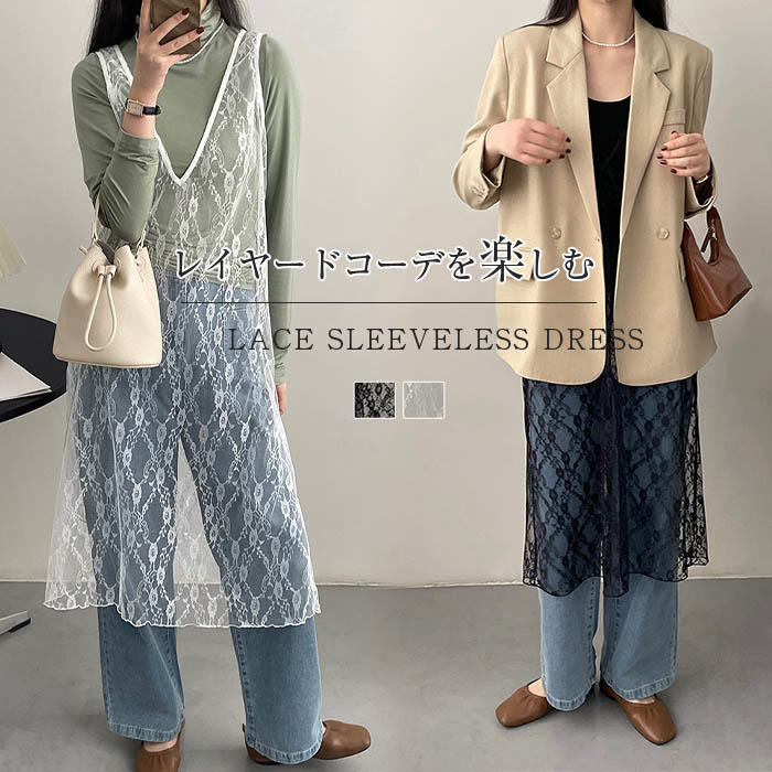チュール レイヤード ノースリーブ ワンピース レディース 刺繍 透け感 ノースリーブノースリーブ 春 夏 コーデ ひざ丈 シアー 透け シースルー ふんわり 重ね着 春夏 レース お洒落