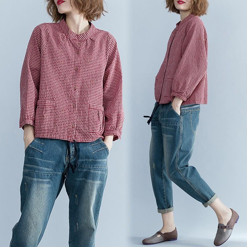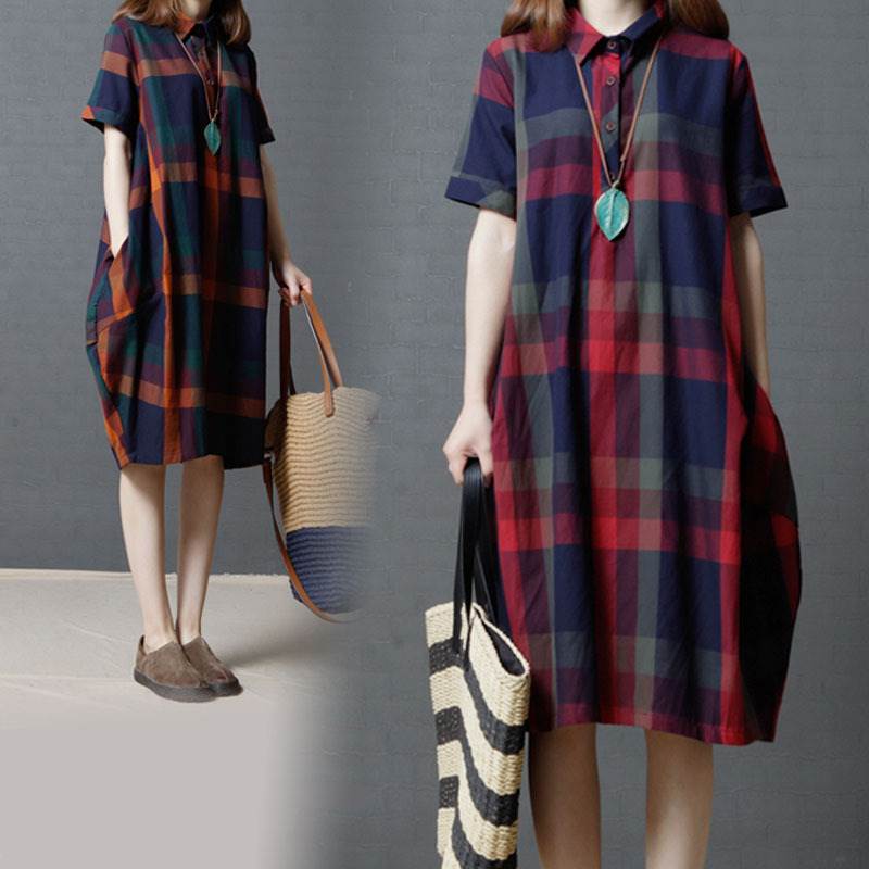ワンピース レディース レトロ チェック柄 綿 コットン 半袖 ゆったり ルーズ ゆる ポケット付き 体型カバー ひざ下 ミディ丈 襟付き ポロ襟 フロントボタン 薄い 清楚 おしゃれ 通勤