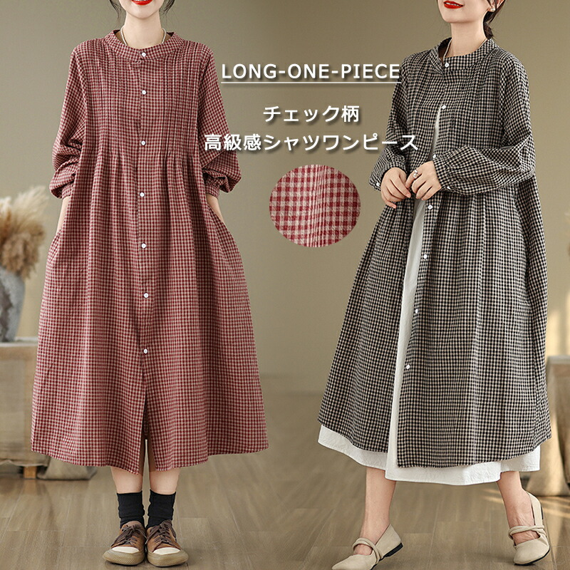 シャツワンピース チェック柄 マキシワンピース レディース 秋 長袖 ワンピース チュニック アウター 夏ワンピース 大きいサイズ 体型カバー シャツワンピ ロングワンピース
