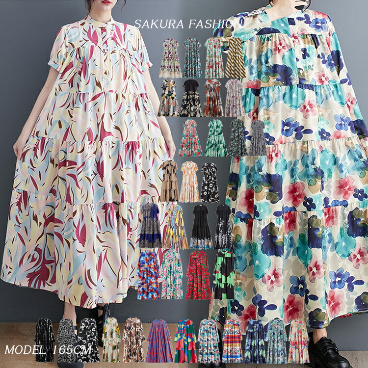 ワンピース フラワー柄 レディース ワンピ ロングワンピース ロングワンピ ロング 花柄 バンドカラー ハーフボタン 長袖 半袖 大きいサイズ ゆったり 上品