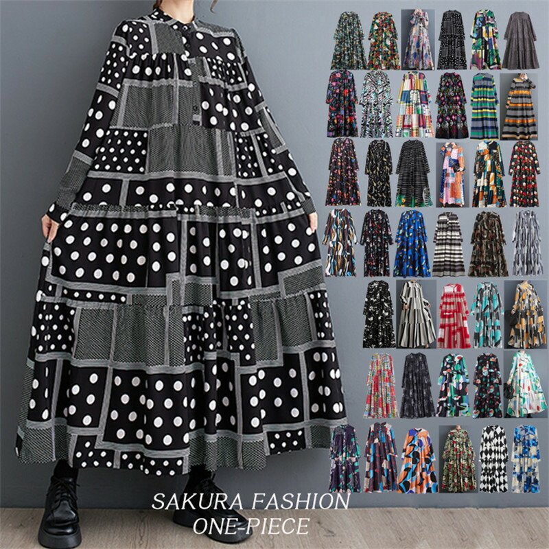 ワンピース フラワー柄 レディース ワンピ ロングワンピース ロングワンピ ロング 花柄 バンドカラー ハーフボタン 長袖 長そで 大きいサイズ ゆったり 上品