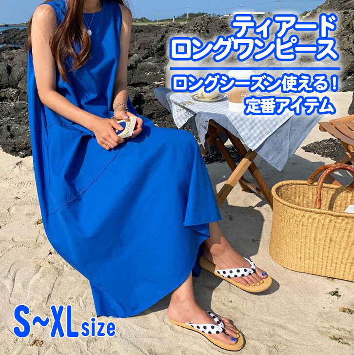 ティアード レディース ロング ワンピース ノースリーブ マキシ ラウンドネック フレア ライン ロイヤルブルー 青 綿 かわいい 大人 きれいめ シンプル カジュアル おしゃれ こなれ感