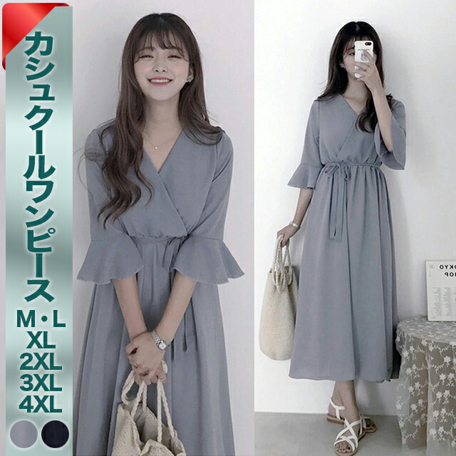 レディース カシュクール ワンピース 人気 大きいサイズ 2 3 4 フレア 膝下 ロング丈 袖あり 半袖 五分袖 ネック シフォン リボン ウエストマーク 大人可愛い きれいめ シンプ