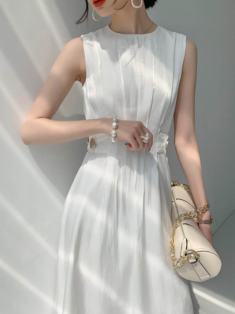 ノースリーブ ワンピース Aライン レディース ドレス プリーツ スカート ミドル丈 ハイウエスト Uネック 大人可愛い きれいめ シンプル 脚長 春 夏 ホワイト ブラック XS S M L XL