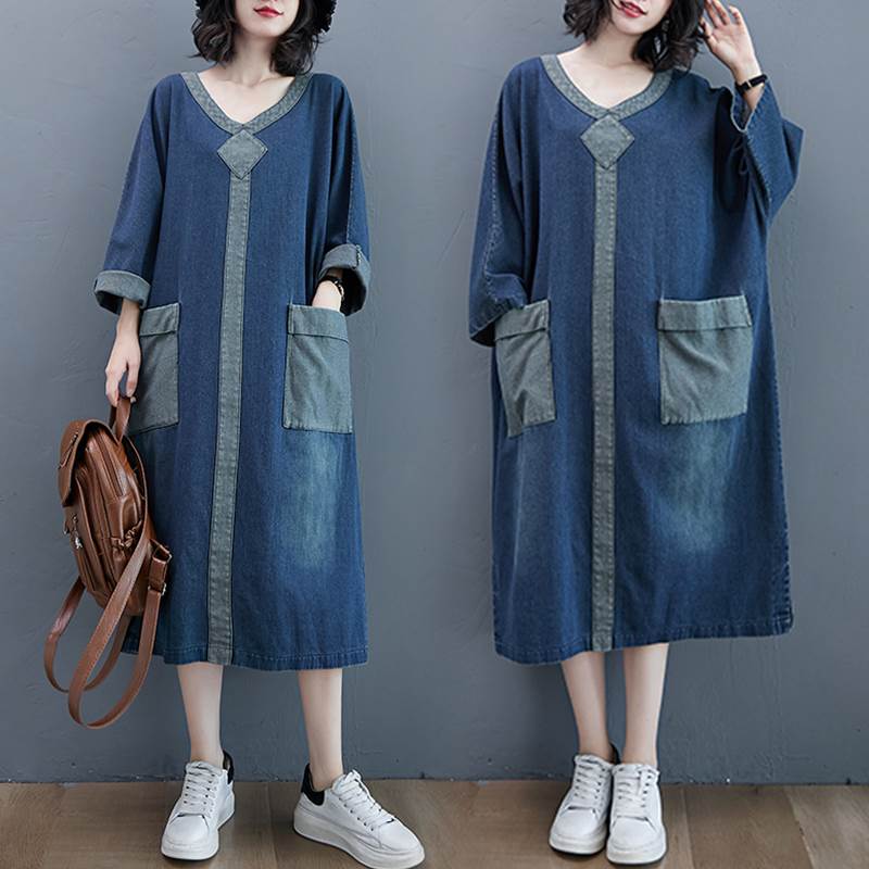 ワンピース デニム レディース ロング ゆったり ルーズ ミモレ Vネック 長袖 ポケット ウォッシュド シンプル コントラスト ドルマンスリーブ Aライン 大きめ 体型カバー おしゃれ ママ