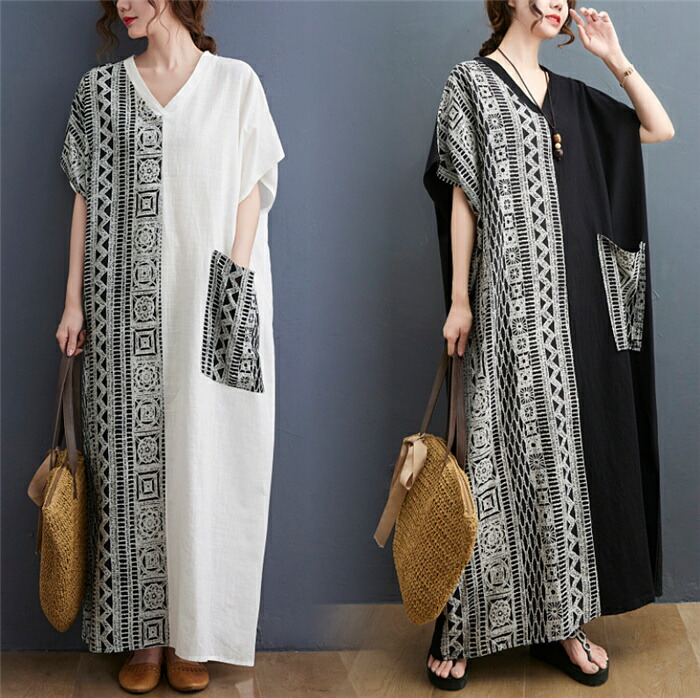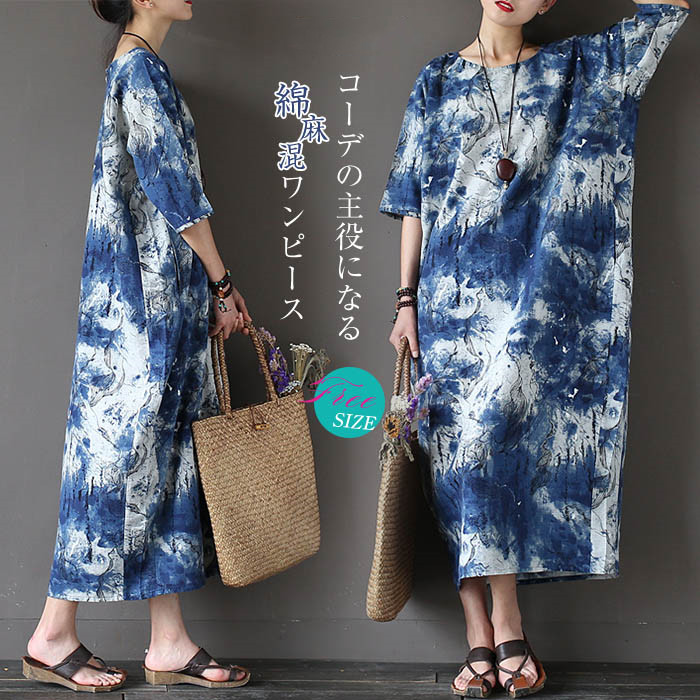 プリント ワンピース 総柄 レディース 半袖 春夏 ロング丈 ロングワンピース 夏 マキシワンピース オーバーサイズ 体型カバー リネンワンピース 大きいサイズ