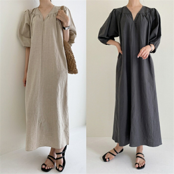 ロングワンピース レディース 綿麻調 パフスリーブ ワンピース 夏 aライン ワンピース ロング丈 きれいめ 切り替え ギャザー 無地 着瘦せ 体型カバー