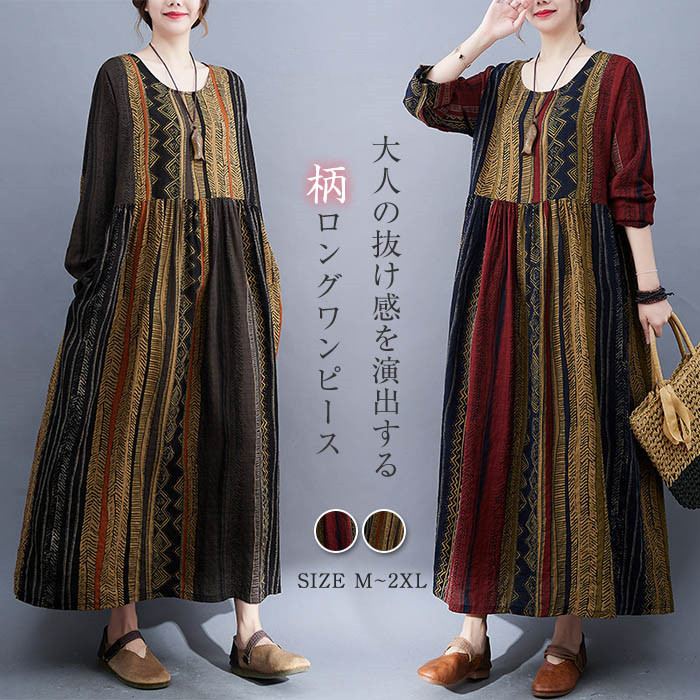 マキシワンピース マキシ ワンピース ロングワンピース レディース マキシ丈 ワンピース 春 夏 秋 ライン ワンピース 無地 着瘦せ 体型カバー