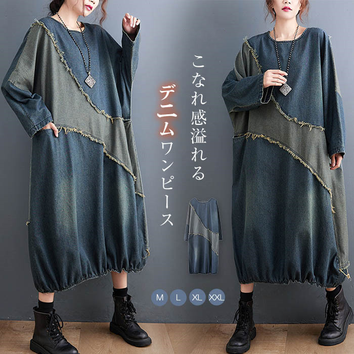 デニムワンピース ロング丈 デニム ワンピース ドルマンスリーブ 長袖ワンピース デニム バルーン カジュアル ポケット付き 春秋 秋