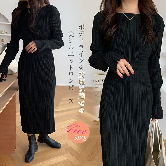 ワンピース レディース 春 長袖 きれいめ フォーマル タイトワンピース ロング タイト ストレッチあり 皺加工 ロングワンピース ハイウエスト ワンピ ロングワンピ ロング丈