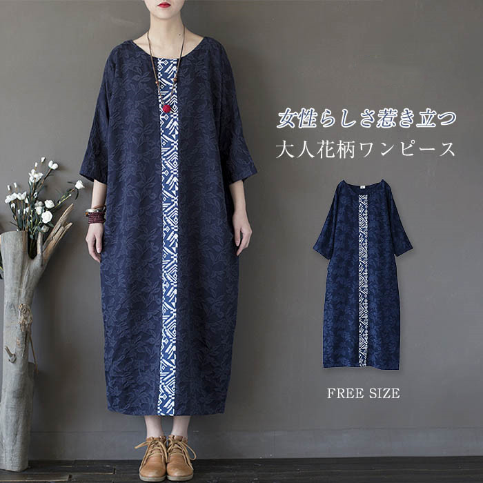 総柄 ワンピース 花柄 レディース 7分袖 春夏 ロング丈 ロングワンピース マキシワンピース オーバーサイズ 体型カバー 花柄ワンピース 大きいサイズ