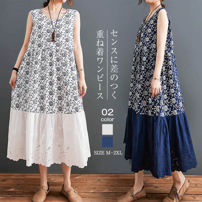 前後2ワンピース ワンピース ノースリーブ ライン レディース ロングワンピース 夏 マキシワンピース ロング丈 マキシ丈 ノースリーブワンピース