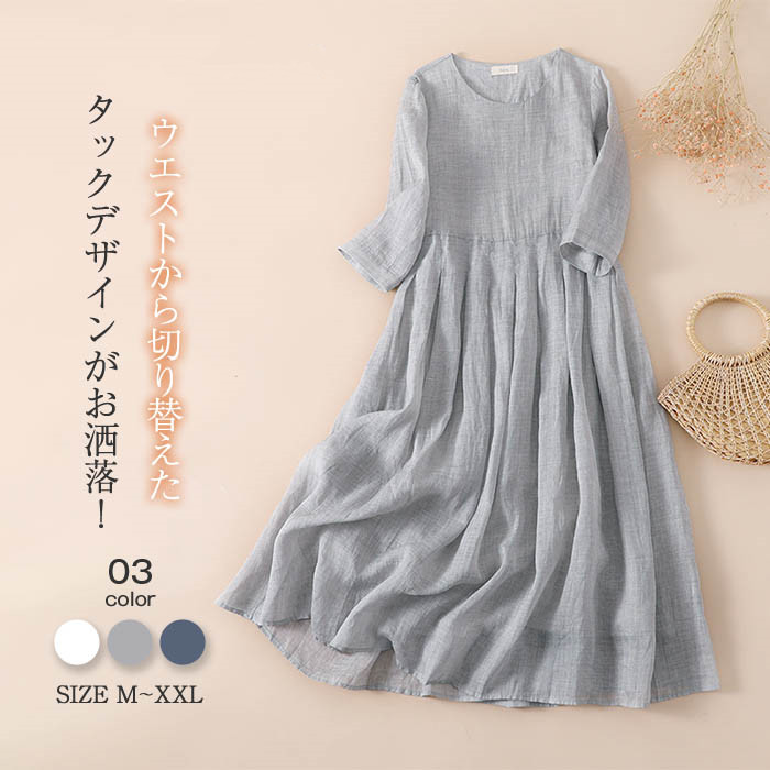 リネン ワンピース ナチュラル ロング ミモレ丈 5分袖 夏 ワンピース aライン レディース フレアワンピース ロングワンピース タック コットンリネン フレア