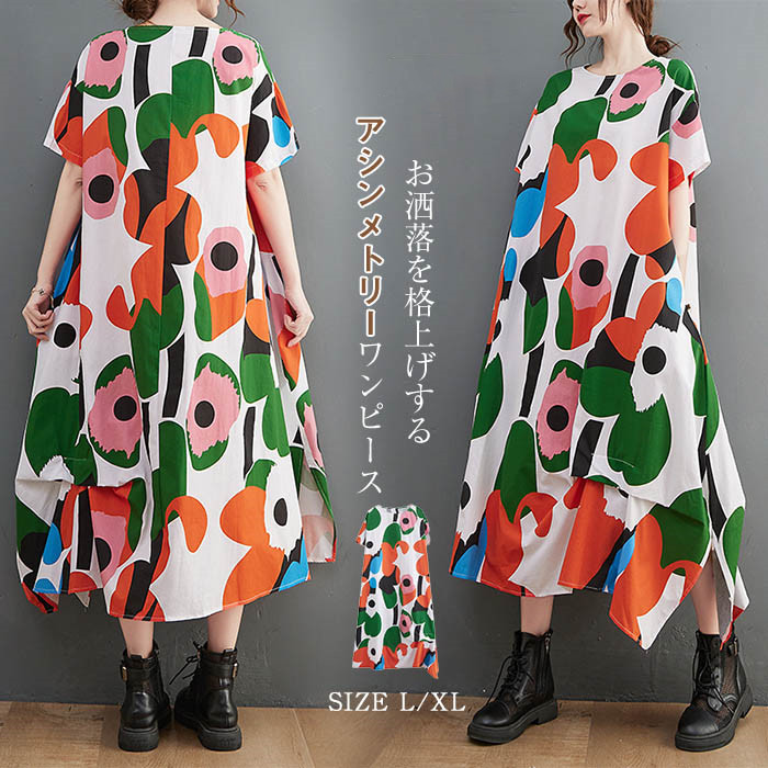 裾 アシンメトリー ワンピース 夏 レディース 半袖 ロングワンピース aライン ワンピース 総柄 フレアワンピース 花柄 ミモレ丈 ロング丈 体型カバー