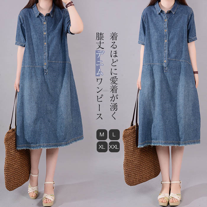 デニム ワンピース 半袖 レディース 夏 膝丈ワンピース ミディアムワンピース デニムワンピース シャツワンピース aラインワンピース