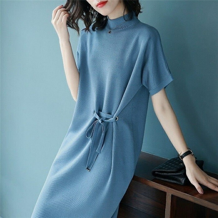 ニットワンピース 半袖 レディース サマーニット ニットワンピ ひざ丈 ミモレ丈 ワンピ エレガント きれいめ 大人 オフィス シンプル ウエストリボン